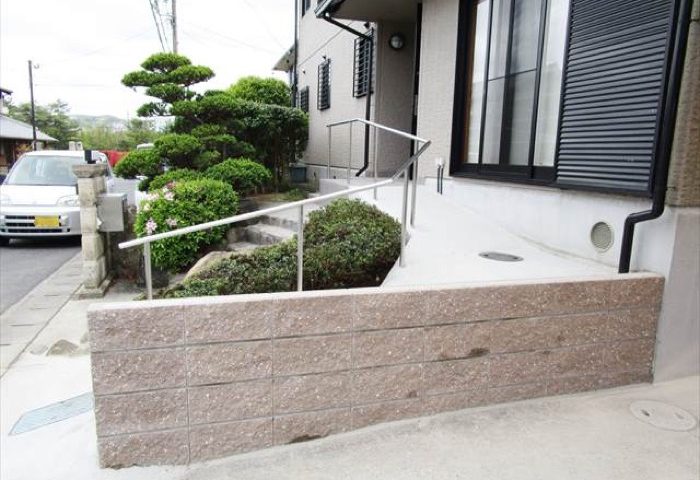 - 玄関前の石積や植木を撤去し、スロープを新設し手摺を取り付けました。